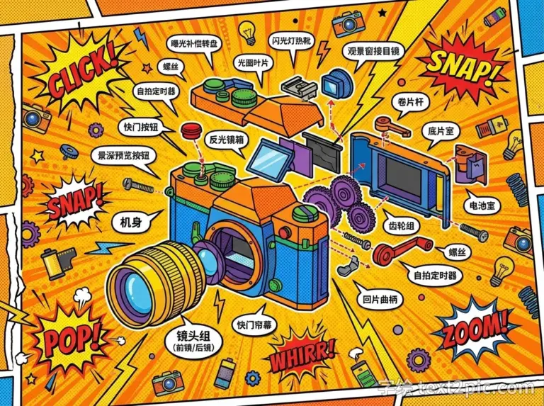 波普艺术风格老式胶片单反相机分解图
