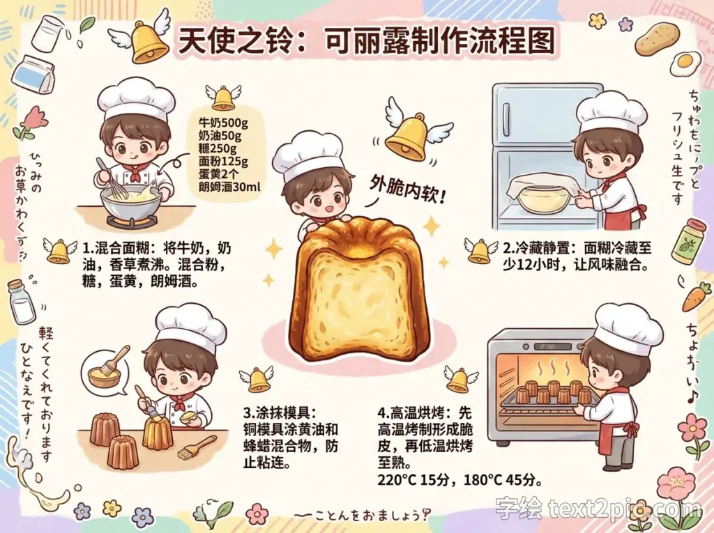 Q版厨师天使之铃可丽露的制作流程图日本流行杂志风格2026年1月9日文生图 生图提示词: 绘制一张可丽露(canelé)的制作流程图,需加上简单说明、食材克数、Q版厨师和天使之铃的象征,采用日本流行杂志风格,但说明要使用简体中文 把上面提示词贴到下面连结可以作同款图 RunningHub一键作同款 标签# 制作流程图# 可丽露# 天使之铃# 日本流行杂志风格# 食谱 上一页 文章 东京晴空塔HUD抬头显示风格结构示意图