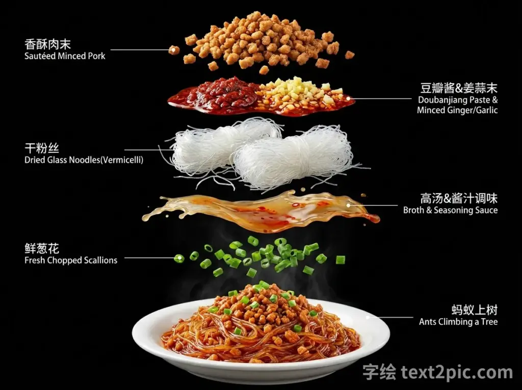 底层: 以白瓷圆盘盛放最终成品,粉丝色泽红亮,肉末均匀吸附在粉丝上,油光发亮,热气腾腾,撒有葱花点缀, 标注文案 “蚂蚁上树/Ants Climbing a Tree”。