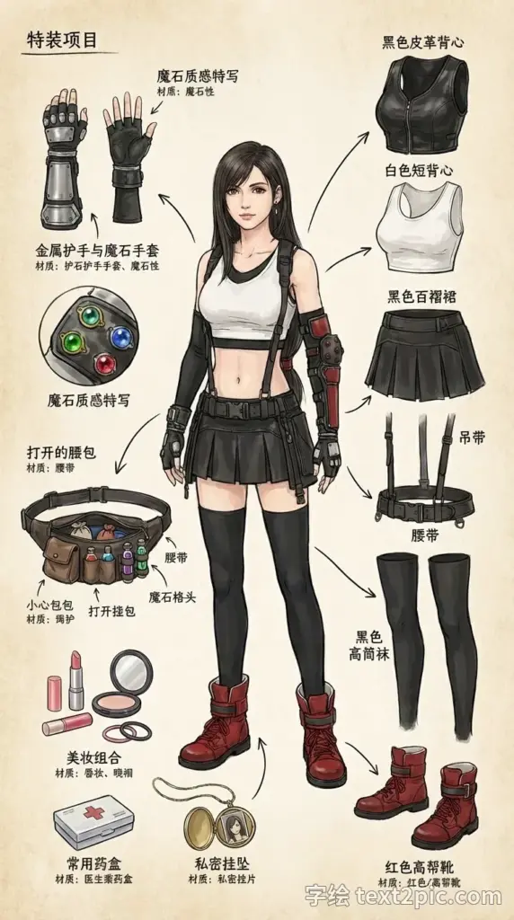 1. 构图布局 :• 中心位 : 放置角色的全身立绘或主要动态姿势,作为视觉锚点。• 环绕位 : 在中心人物四周空白处,有序排列拆解后的元素,右侧依序摆放由上而下的分解衣着,左侧摆放首饰、 道具、私密与随身物品