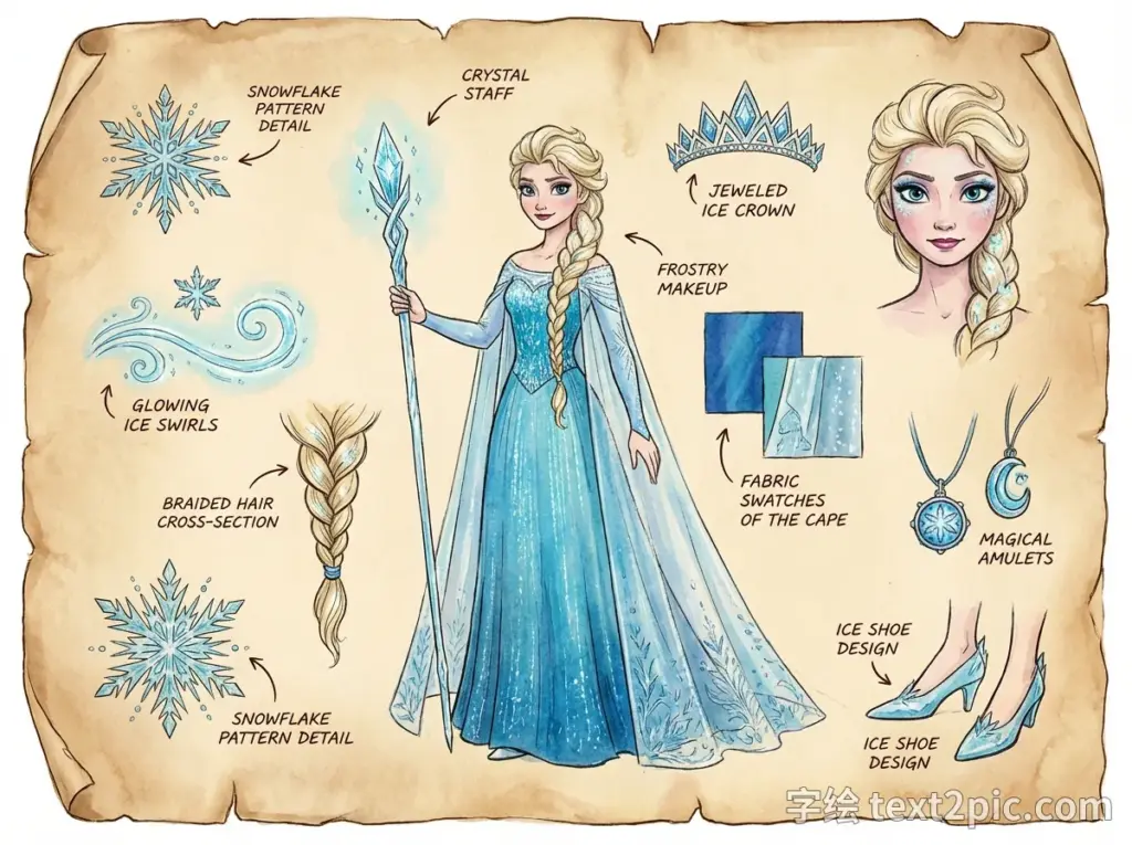 A detailed character design sheet on vintage parchment paper. Center: A beautiful Ice Queen resembling Elsa with a long blonde braid, wearing a sparkling blue gown and cape, holding a crystalline ice staff. Surrounding details: Deconstructed close-ups of intricate snowflake patterns, ice magic effects, braided hair texture, a crystal crown, facial features, fabric texture of the cape, magical artifacts, and ice shoes. Text labels and arrows pointing to specific design elements. Style of hand-drawn watercolor and ink illustration, classic storybook art, high fantasy concept art, intricate linework, warm lighting.