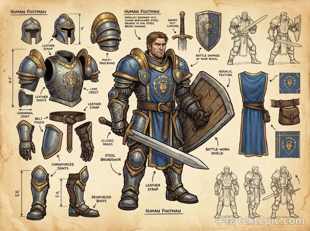 艺术风格:手绘水墨插画,经典的魔兽世界奇幻概念艺术,大胆的风格化比例,夸张的盔甲造型,精细的线条,柔和的中世纪色调,温暖的羊皮纸色调,高奇幻策略游戏美学。所有说明文字都是英文