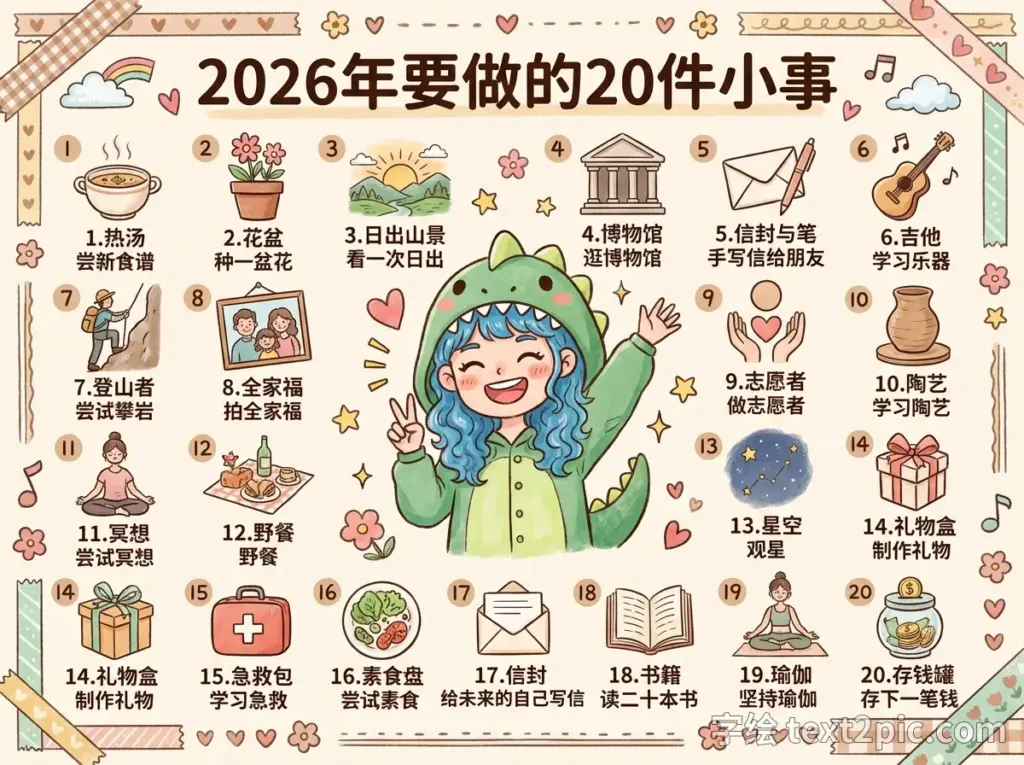 【AI生图提示词:2026年要做的20件小事手帐风插画】
