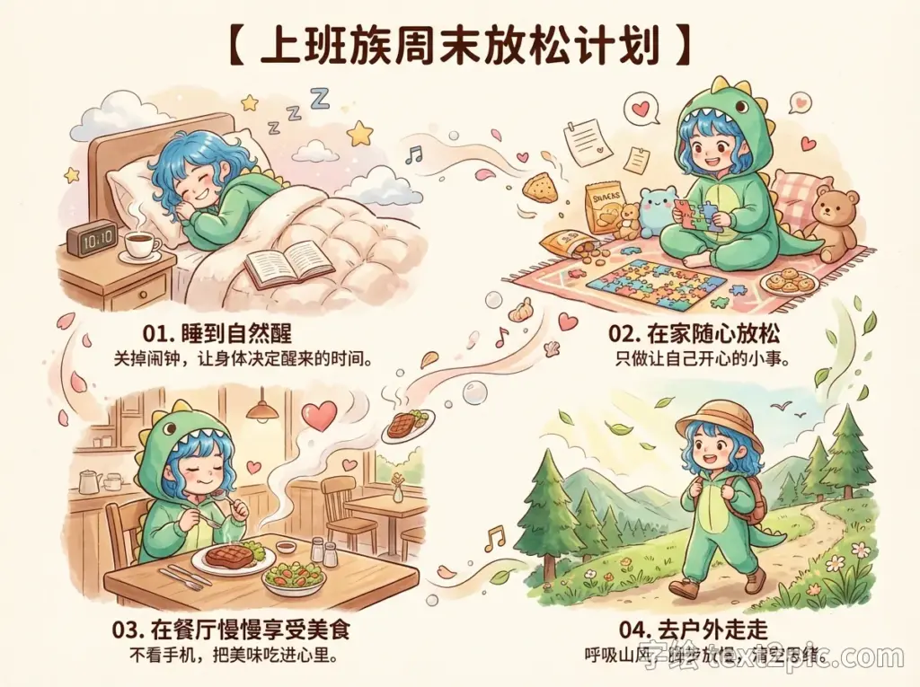 布局:标题“【上班族周末放松计划 】”居中放大置于顶部;每个项目编号+行动名称悬浮于对应场景上方,说明文字自然放置于场景下方或侧边空白处,确保编号01–04按2×2顺序清晰可辨。