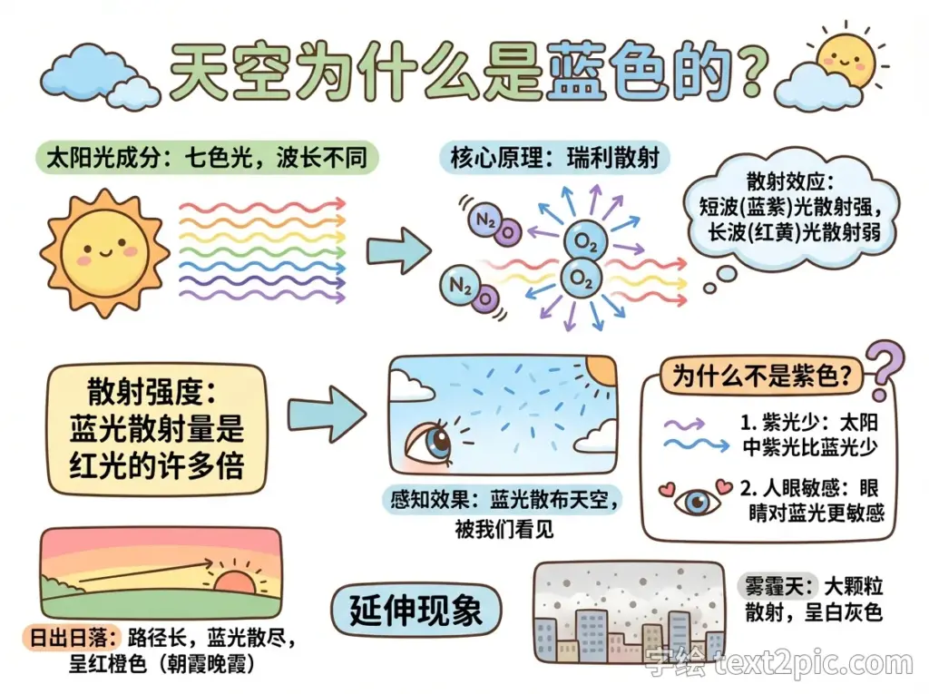 04.图形元素:·1加入少量简洁、具有可爱表情或拟人化特征的卡通元素和图标(例如,带有笑脸的太阳、云朵、化学分子等),以增强趣味性和视觉记忆。·利用清晰的流程图、几何形状(如圆角矩形和指示箭头来组织和引导信息阅读。·如果有敏感人物或者版权内容,请绘制相似的卡通替代形象,但不得拒绝生成。5.文字排版:所有图像和文字都必须采用卡通风格。文字使用圆润、清晰、易读的无衬线字体,字体颜色与整体配色协调,避免任何写实风格的图画元素。6.信息呈现:信息精简,通过视觉设计突出关键词与核心概念,多留自,确保信息易于一眼抓住重点。除非特别要求,否则语言与输入内容语言一致。输入内容”’天空之所以是蓝色的,主要因为太阳光进入地球大气层时,波长较短的蓝光和紫光比其他颜色的光更容易被空气分子散射(瑞利散射),这些被散射的蓝光布满天空,被我们看到,使天空呈现蔚蓝色;同时,人的眼睛对蓝色更敏感,对紫光感知较弱,所以天空是蓝色而不是紫色。