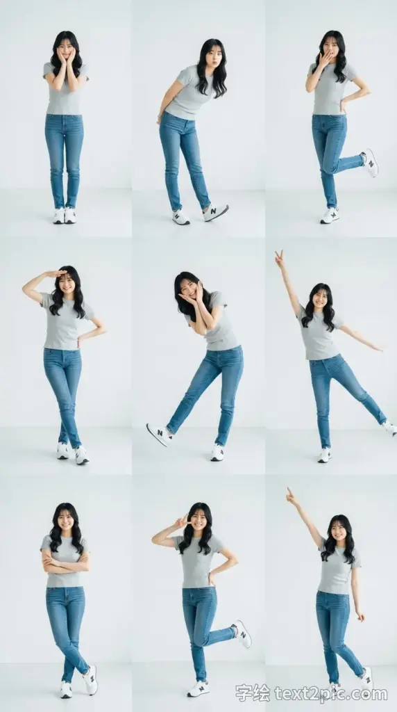 请将输入的图片生成下面九个拍照姿势,要求背景白色,以3×3 方式排列,以下是按从左到右、从上到下的顺序对每种姿势的详细描述: