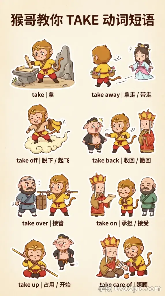 以《西游记》中的孙悟空(猴哥)为统一主角,在取经路、花果山等经典西游场景中,通过“拿、带走、收回、接管、承担、占用、照顾”等高度具象的动作隐喻,将 TAKE 及其常见动词短语转化为一眼即可理解的可视化画面。