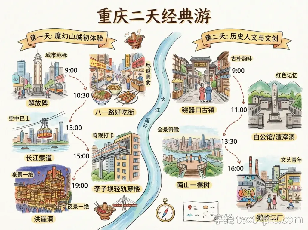 重庆经典二日游旅游行程图2026年2月1日文生图 生图提示词: 设计一个重庆2天一夜的行程,标题为”重庆二天经典游”,把行程内容整理为一个手绘风信息图,每个行程节点都标注时间、景点和景点插图。 文字以简体中文显示 把上面提示词贴到下面连结可以作同款图 RunningHub一键作同款 阅读数 27 标签# 二日游# 旅游行程图# 重庆 上一页 文章 香港国风地标城市微缩图 下一页 文章 金字塔原理漫画版知识笔记