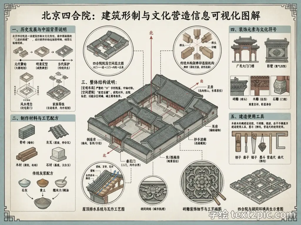 制作一张关于北京四合院的信息可视化流程图A3大小展板。