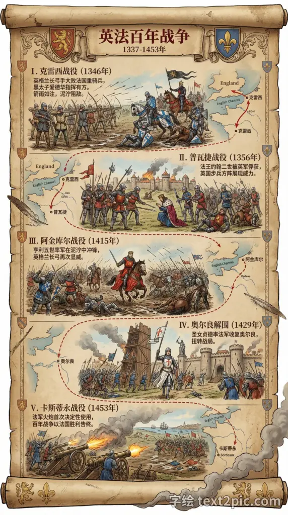 核心主题:以中世纪羊皮纸卷轴为载体的英法百年战争历史信息图,重点呈现克雷西战役、普瓦捷战役、阿金库尔战役、奥尔良解围、卡斯蒂永战役五大关键节点,需体现历史准确性与欧洲中世纪艺术风格。
