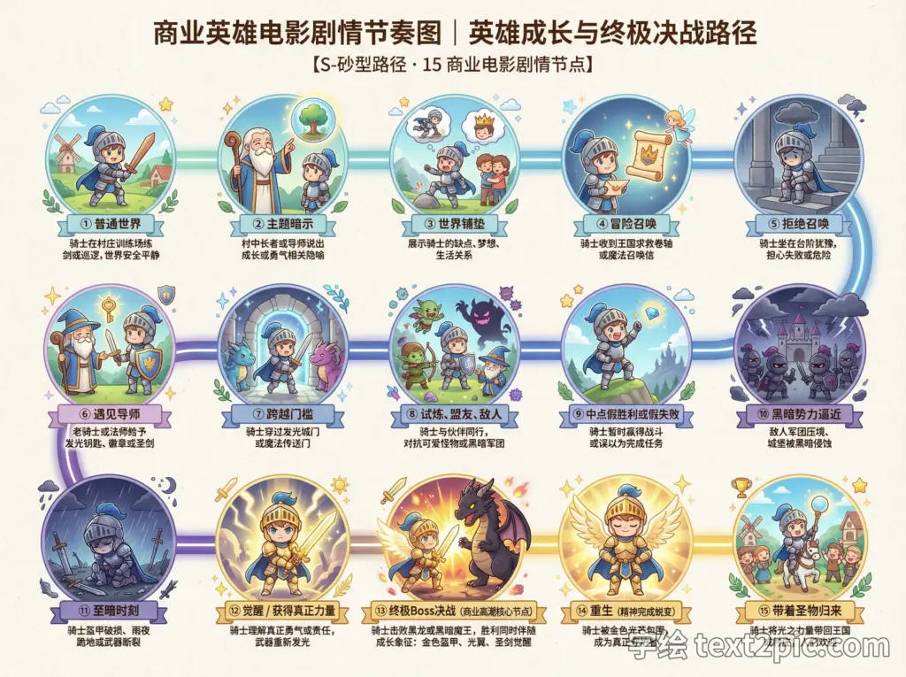 整体布局采用流程图形式,一条流畅的 S形成长路径 从起点延伸到终点,共包含 15 个商业电影常用剧情节点,强调从普通人到英雄、再到击败终极Boss并完成精神重生的完整商业叙事结构。