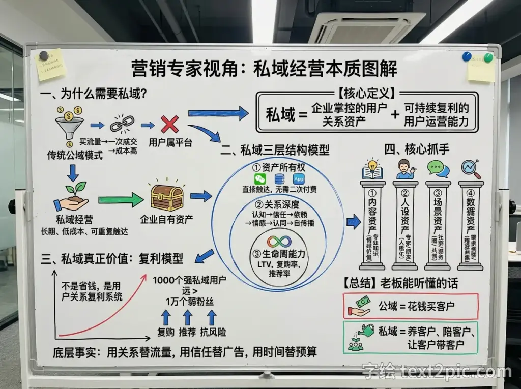 制作一幅办公室白板插图,用用带标签的箭头、图标和清晰易读的简体中文总结解释下面文字内容,”’从营销专家视角看,私域经营本质不是“加了多少好友”,而是: