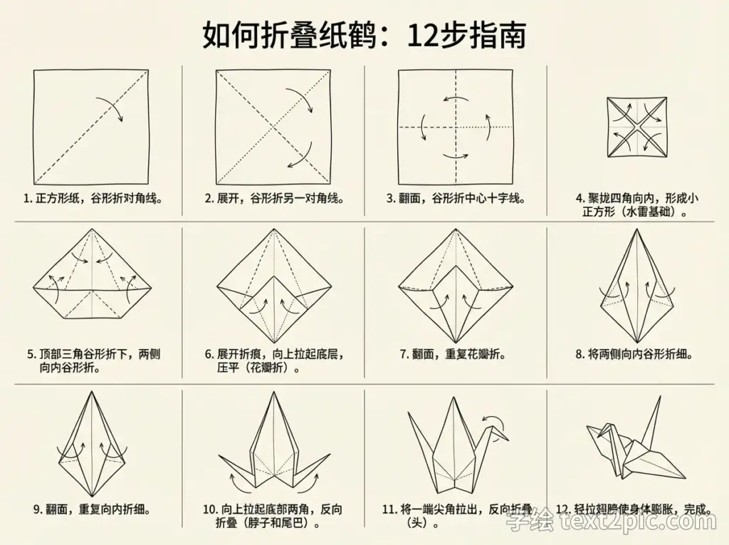 折叠纸鹤步骤图2026年2月19日文生图 生图提示词: 制作一张信息图来说明“如何折叠纸鹤”。图中包含12个关键折叠步骤的分解图,并用极简线条风格标注折痕方向(山形折/谷形折)。 把上面提示词贴到下面连结可以作同款图 RunningHub一键作同款 阅读数 9 标签# 折叠纸鹤# 步骤图# 流程图 上一页 文章 挑选宠物狗因素比较指南 下一页 文章 NBA科比职业生涯荣誉描述