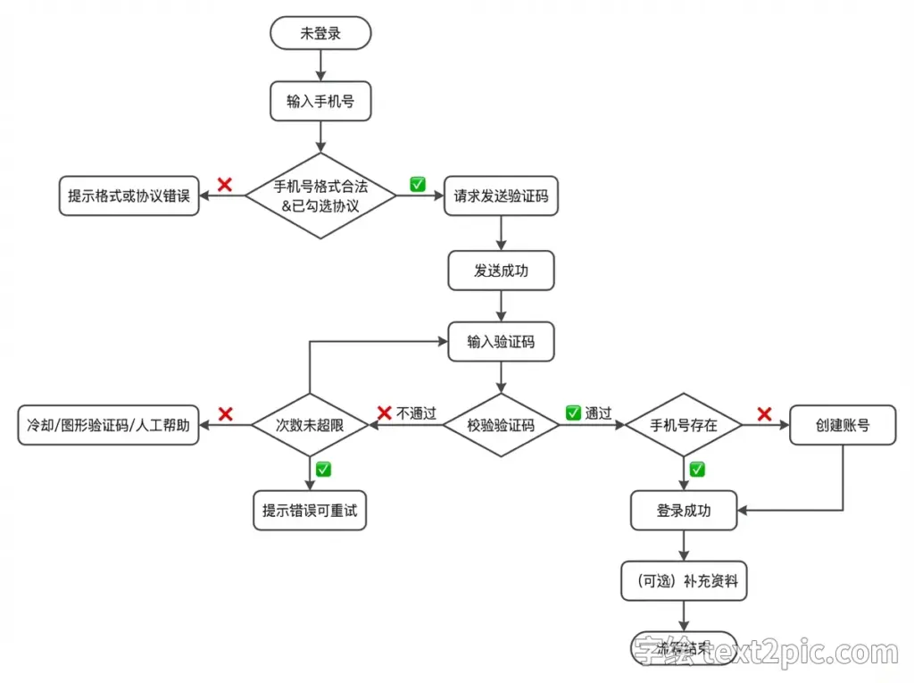 ”’ 未登录 → 输入手机号手机号格式合法 & 已勾选协议 → 请求发送验证码发送成功 → 输入验证码校验验证码:✅ 通过:手机号存在 → 登录成功手机号不存在 → 创建账号 → 登录成功 →(可选)补充资料 ❌ 不通过:次数未超限 → 提示错误可重试超限 → 冷却/图形验证码/人工帮助”’