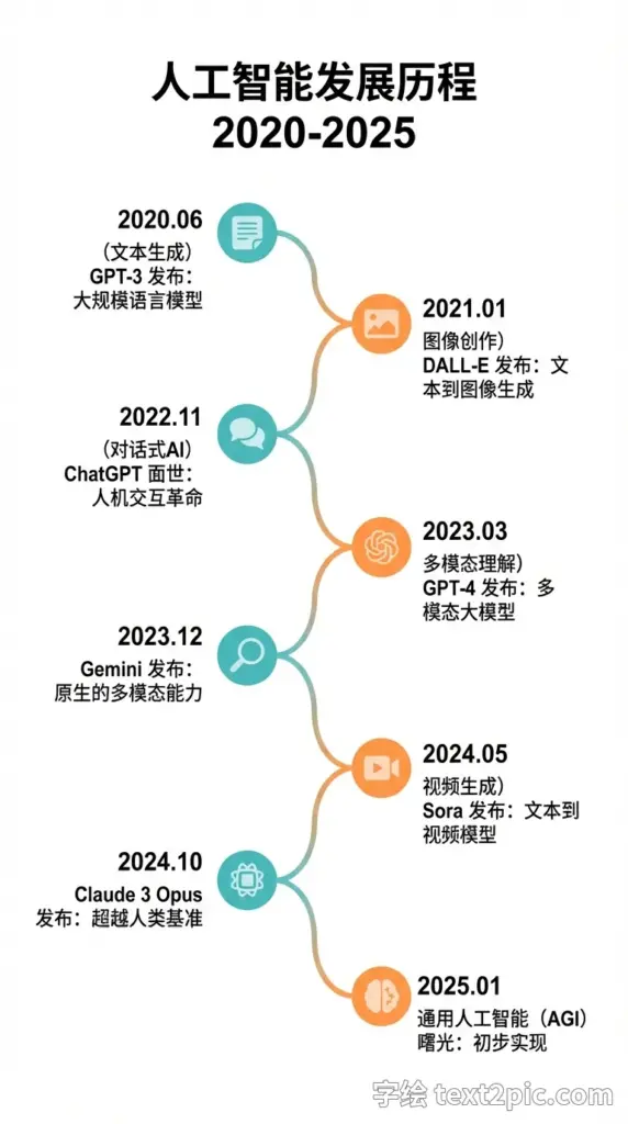 简洁的横向时间轴信息图:“人工智能发展历程 2020-2025”,包含 8 个里程碑事件及具体日期,底色为白色,配以简洁的图标、柔和的连接线、扁平化的青橙色调, 清晰的文本渲染效果。文字以简体中文显示