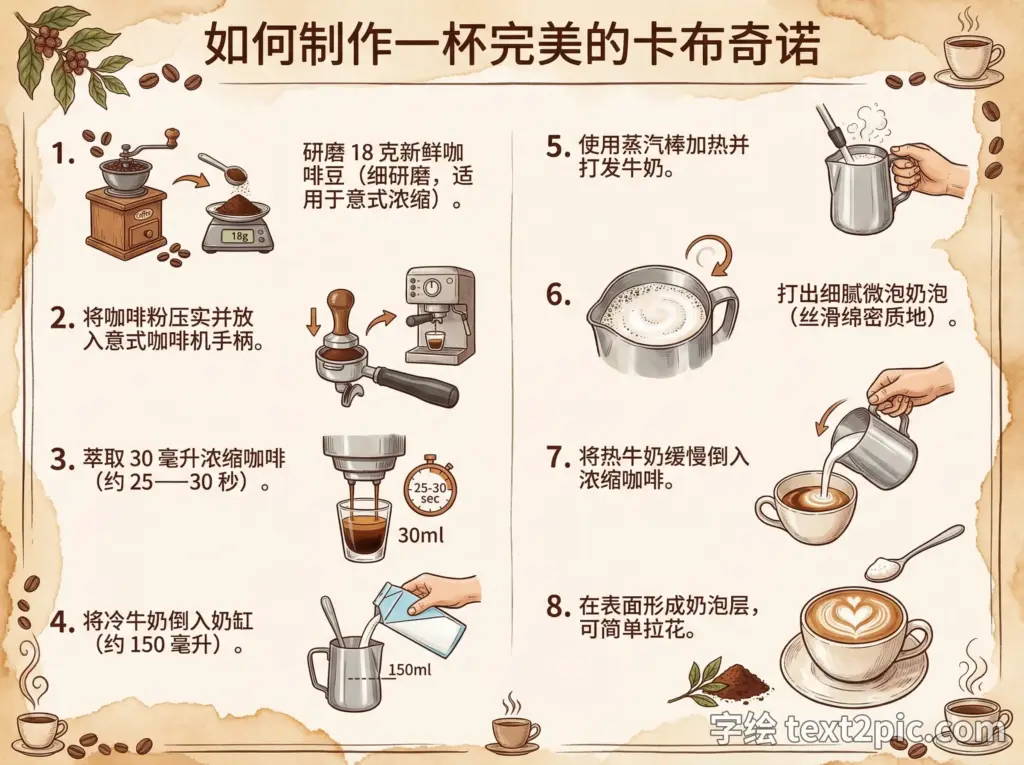 制作一张图文并茂的说明图:“如何制作一杯完美的卡布奇诺”