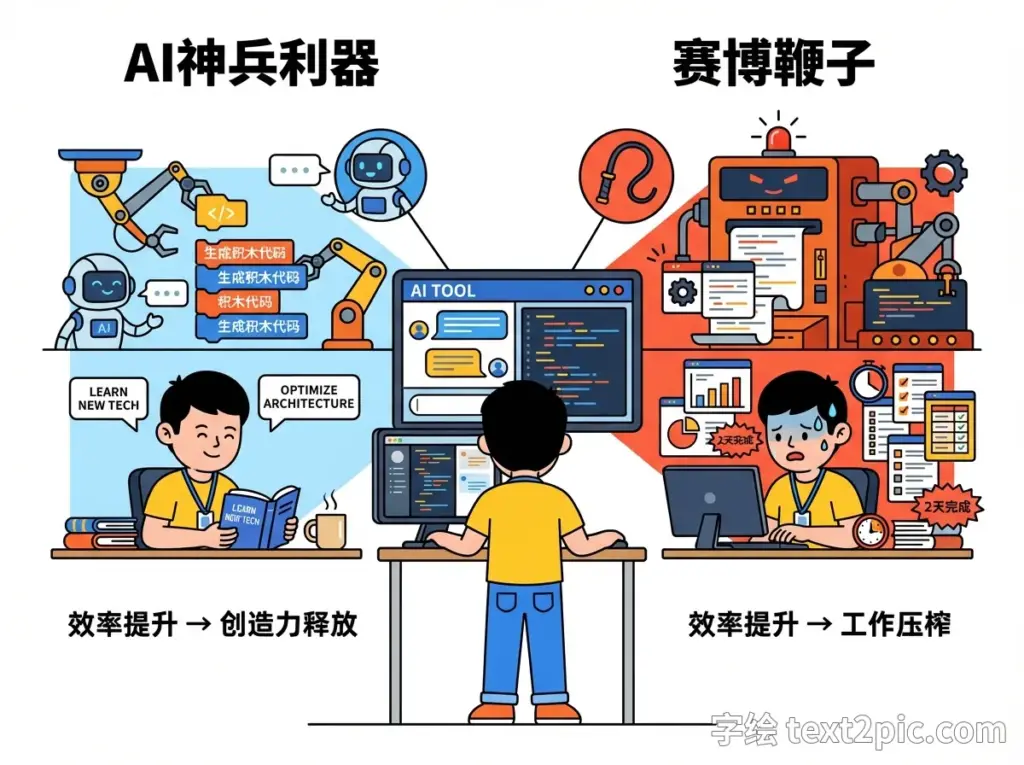 幽默但带有思考意味。画面表达AI既可以成为提升生产力的工具,也可能成为压榨效率的手段,关键在于企业如何使用技术。