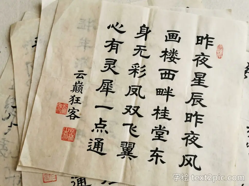 竖排隶书书法特写,米白浅纹半生熟宣纸,略有自然褶皱;黑墨隶书从右至左竖排,四行字第一行「昨夜星辰昨夜风」第二行「画楼西畔桂堂东」第三行「身无彩凤双飞翼」第四行「心有灵犀一点通」,左侧落款「云巅狂客」;多枚朱红篆刻印章点缀,印泥饱满清晰;多张书法纸随性迭放,背景露出淡字痕迹;柔和自然光突出墨色光泽与纸纹细节;整体呈书法大师写作书法时的风格,雅致古朴、灵动沈静。