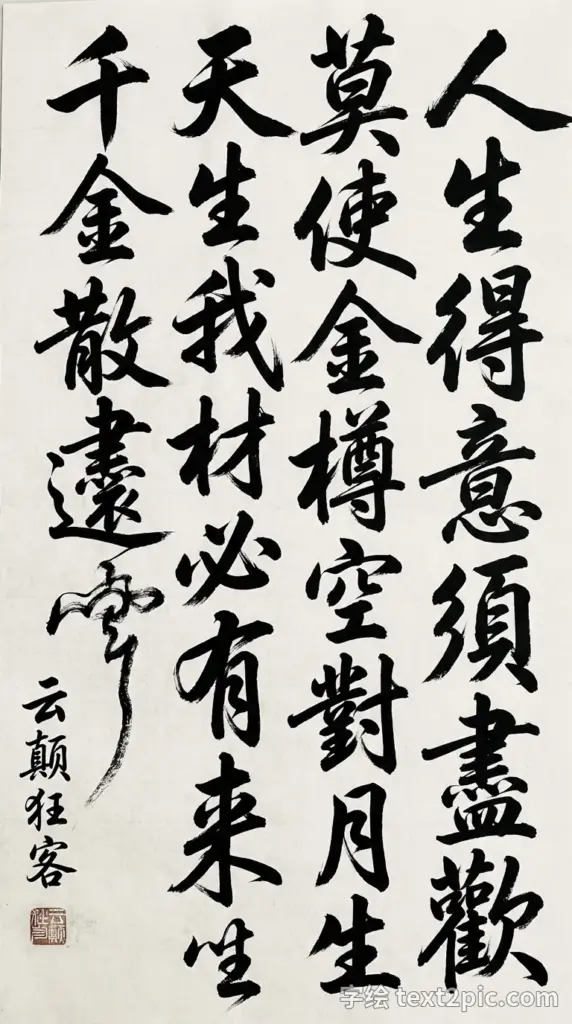 中国传统书法作品,狂草风格,笔触极具动感与张力,线条奔放夸张,富有强烈节奏与抽象表现力,黑色墨迹书写于宣纸之上,大量飞白效果(干笔拖擦产生的留白纹理),笔画中可见明显枯笔与断裂感,整体构图自由不拘、气势奔涌,竖幅多行书写,内容为古诗:“人生得意須盡歡,莫使金樽空對月。天生我材必有用,千金散盡還復來。”,书法落款固定在左下侧(竖排靠边位置):“云颠狂客”,使用小字行书或行草书,字号明显小于正文,排版自然。落款下方配有红色印章(印章清晰、略有旧印泥质感,但不渗墨),黑白对比强烈,富有原始书写能量,柔和自然光,高细节,真实水墨狂草艺术风格