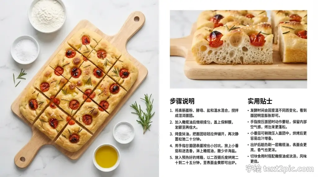 左侧大图:一块金黄色、表面有明显凹坑的意式佛卡夏放在浅色木质砧板上,砧板带手柄,面包被切成整齐方块。佛卡夏表面点缀烤至微焦爆汁的小番茄、新鲜迷迭香叶和带光泽的橄榄油,表皮金黄,内部松软多孔,采用略微俯视的45度摄影视角,自然明亮光线,突出面包蓬松结构与烘烤质感。主图周围自然摆放少量配料作为点缀,包括一小碗面粉、一小碗粗盐、一小碗金黄色橄榄油、少量新鲜迷迭香枝叶,摆放整齐、简洁、不杂乱。