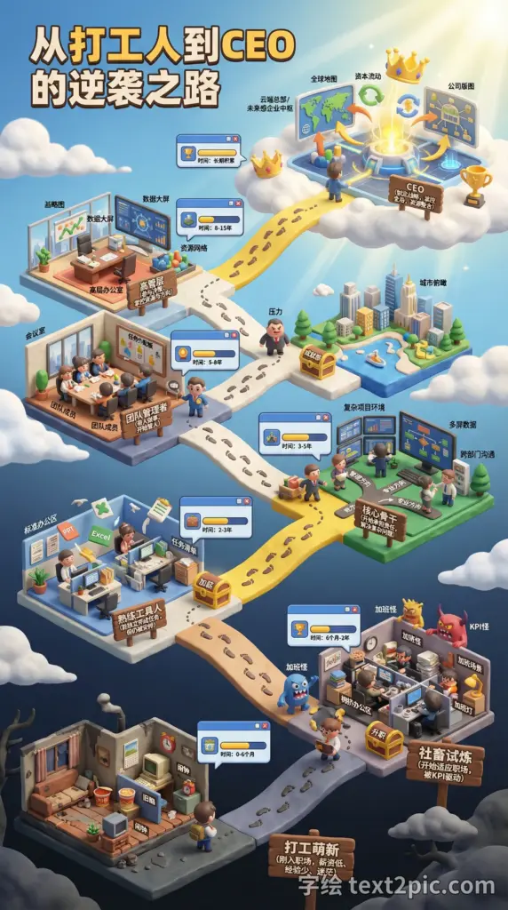 基于主题【从打工人到CEO的逆袭之路】,创作一张3D游戏关卡地图风格的信息图海报。